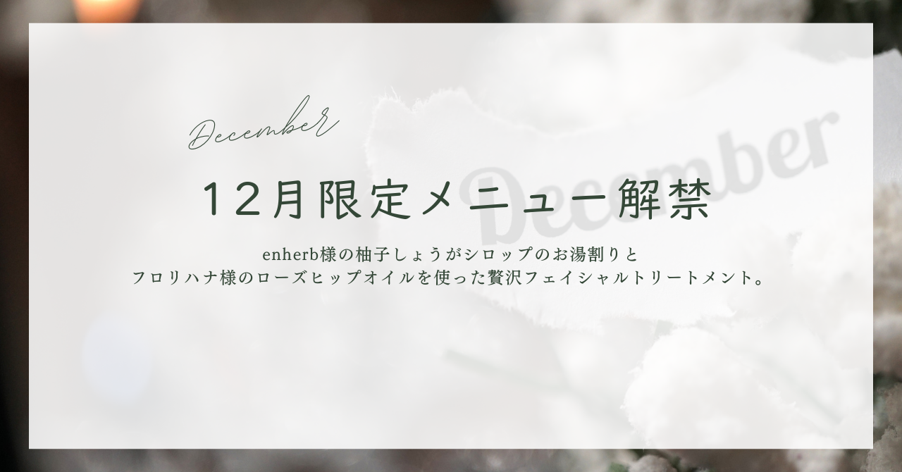 12月限定フェイシャルトリートメント ご予約H様 blog 2025.12.05 12月限定で、enherb様の柚子しょうがシロップのお湯割りとフロリハナ様の超臨界流体抽出で得られたローズヒップオイルのフェイシャルトリートメントを解禁中。 常連のH様が早速ご予約くださり、素晴らしいひと時をご一緒できました。 ご来店ありがとうございました。月末のご予約をいただき、またお会いできるのを楽しみにしております。