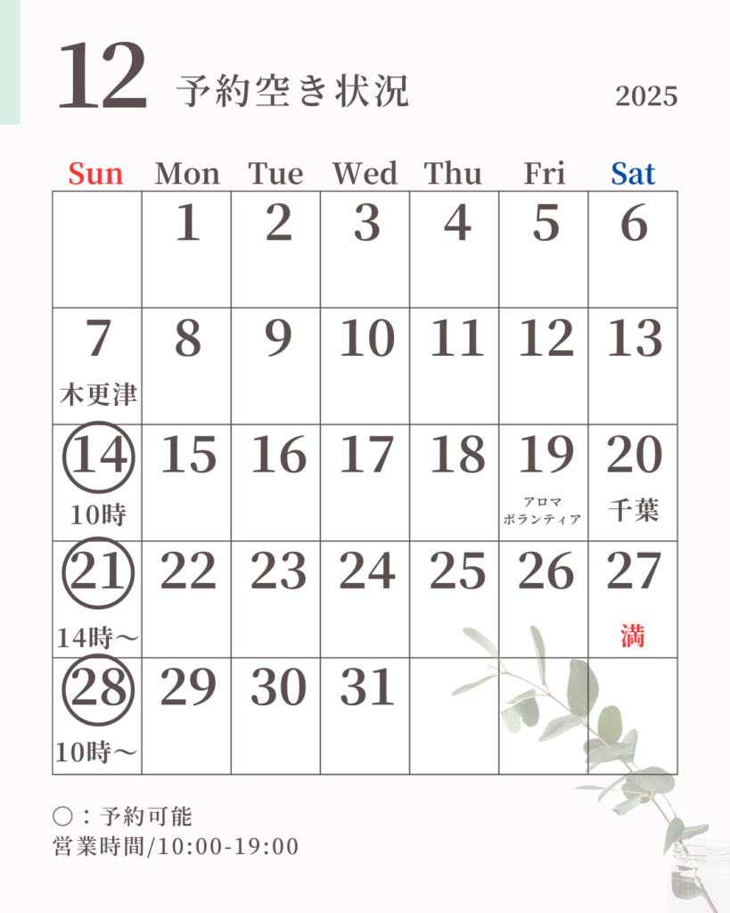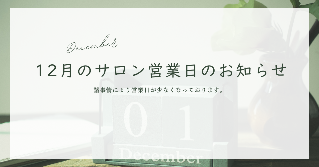 2025年12月サロン営業日のお知らせ blog 2025.12.05 2025.12.01 こんばんは🌃一気に寒さが厳しくなり、ホッカイロが手放せない加々美です。 12月ですが、サロン営業日は諸事情により少なくってしまっています。 ご迷惑をご心配をおかけしておりますが、何卒よろしくお願い申し上げます。