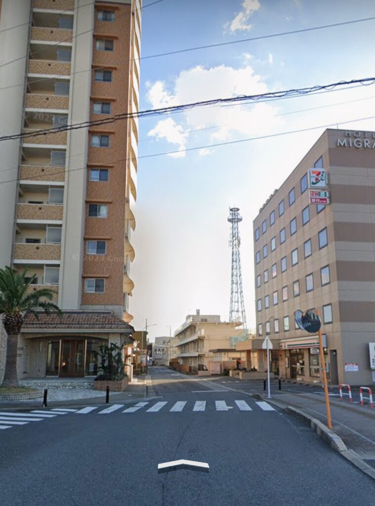 右方向へ進むと大きなマンションとホテルが見えてきます。
